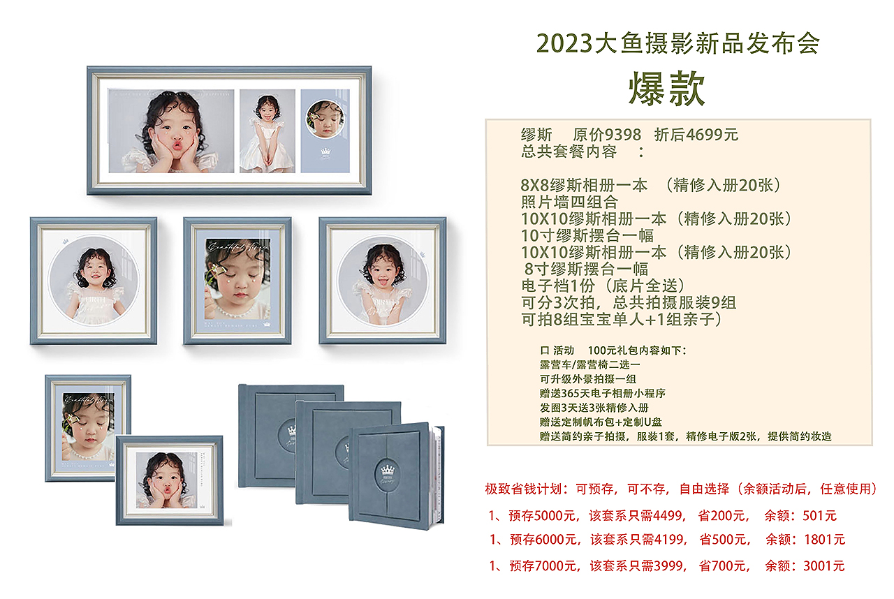 套系报价是基于客户同意大鱼摄影工作室从所拍摄作品中选取带有客户肖像的优秀作品用于包含但不限于网络、杂志、海报、展览、比赛、书籍等合法用途。有异议或特殊要求请单独向我们询价。